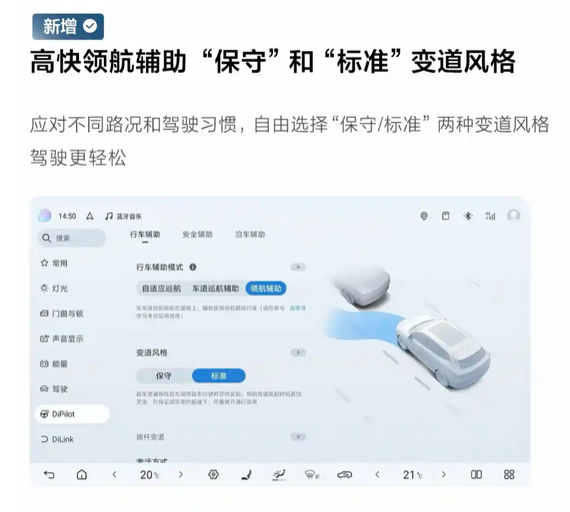具体来说,海豹06 DM-i智驾版、以及高快领航辅助“保守”和“标准”变道风格等功能。