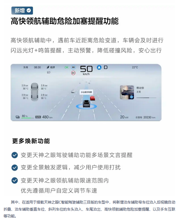 而搭载天神之眼B智能驾驶辅助激光版的车型则会新增领航辅助通行效率优先、还有高快领航辅助危险加塞提醒,海洋网旗下的13款车型即将迎来全面的OTA升级。