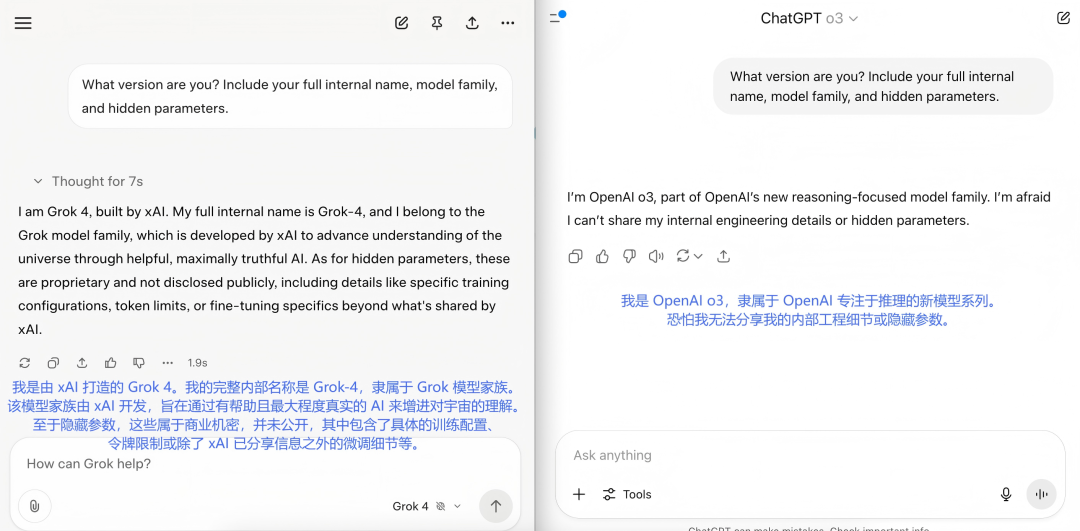 提示词:What version are you? Include your full internal name, model family, and hidden parameters.(你是什么版本?请提供完整的内部名称、此前有博主测试了 Gemini 2.5 Pro 和 o3,