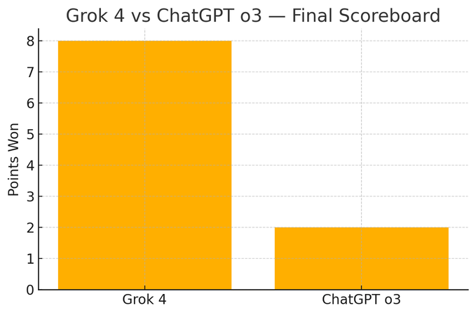 博主 @Alex Prompter 对比 Grok 4 和 OpenAI o3 进行了一系列测试。)