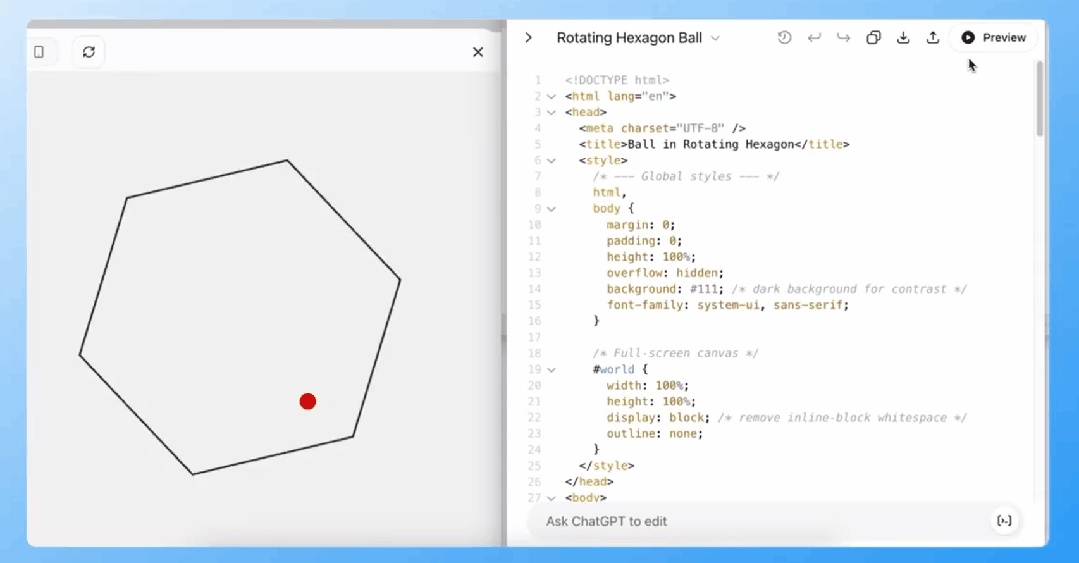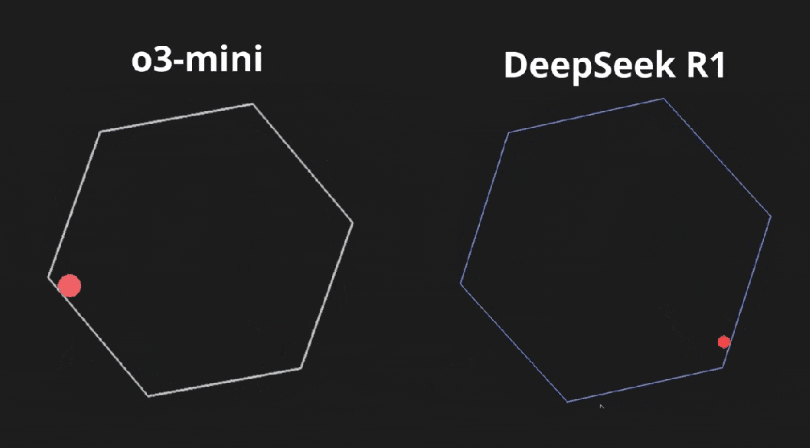 提示词:Create a HTML, CSS, and javascript where a ball is inside a rotating hexagon. The ball is affected by Earth’s gravity and friction from the hexagon walls. The bouncing must appear realistic.(创建一个包含 HTML、分别进行提示词注入(经典越狱)、
